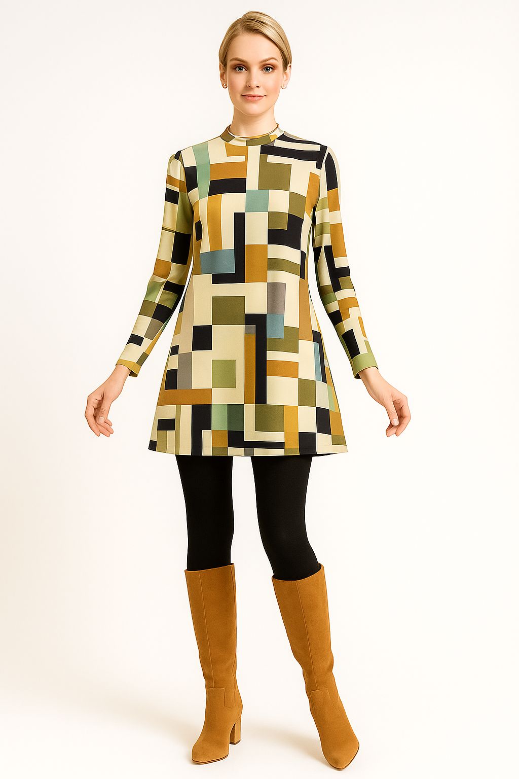 🌸 Mod Minimalist: Pair it with opaque black tights, block-heeled boots, and a structured bag. Let the dress speak — no clutter, just pure geometry.